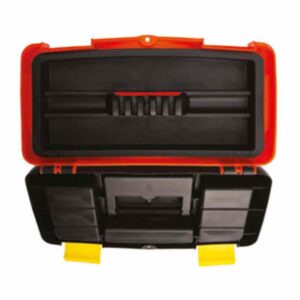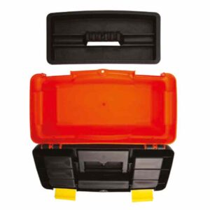 Durable polypropylene tool box includes removable storage tray and receded top for screws and washers. It comes in a compact design with plastic grip handle for comfort.